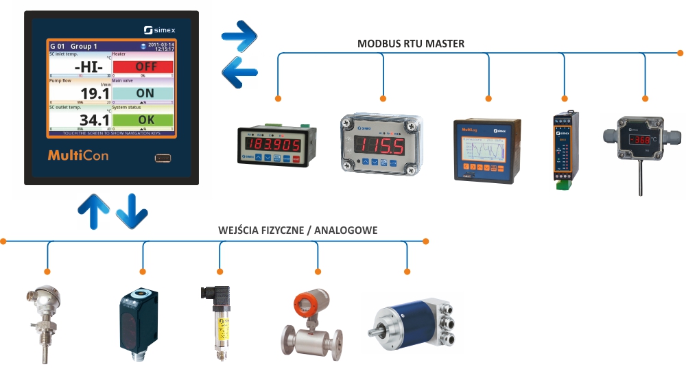 MultiCon jako urządzenie wielofunkcyjne łączy w sobie najlepsze cechy wielokanałowego miernika, regulatora oraz rejestratora. Co więcej, dzięki zaimplementowanemu protokołowi Modbus RTU oraz możliwości wyposażenia w trzy interfejsy RS-485, doskonale sprawdza się jako konwerter. Z dziecinną łatwością radzi sobie z konwersją cyfrowego sygnału Modbus na sygnał analogowy, jak również z analogowego na sygnał cyfrowy. Przewagą nad standardowymi konwerterami jest możliwość podglądu wszystkich przetwarzanych sygnałów na dużym kolorowym wyświetlaczu dotykowym.